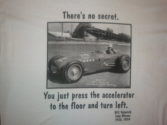 - Every year we create a shirt for the Checkered Past Soiree. Here are some of the quotes from past years: “Drive it like you stole it,” “Race Globally – Drink Locally,” “If everything seems under control, you’re just not going fast enough” by Mario Andretti, and “You just don’t know what Indy means” by Al Unser, Jr. Here’s this year’s shirt. Considering the race we just had, it still seems apropos after all these years.
